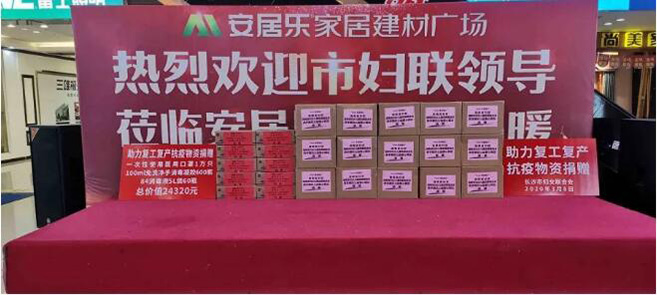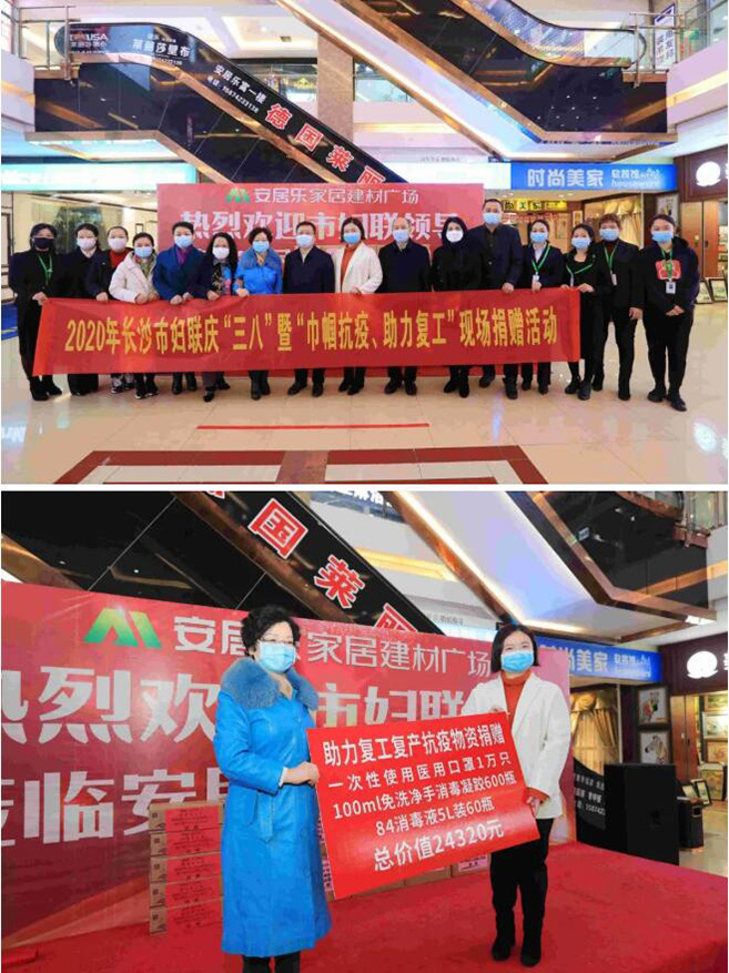 3月8日上午,长沙市人民政府副市长陈澎、市妇联主席文方等领导一同来到安居乐家居建材广场,为复工复产在一线的姐妹们送来了节日问候,并为安居乐家居建材广场捐赠了价值约24000多元的防疫物资,助力安居乐复工复产。安居乐总裁周虹妤、总经理王岩等工作人员进行了接待。