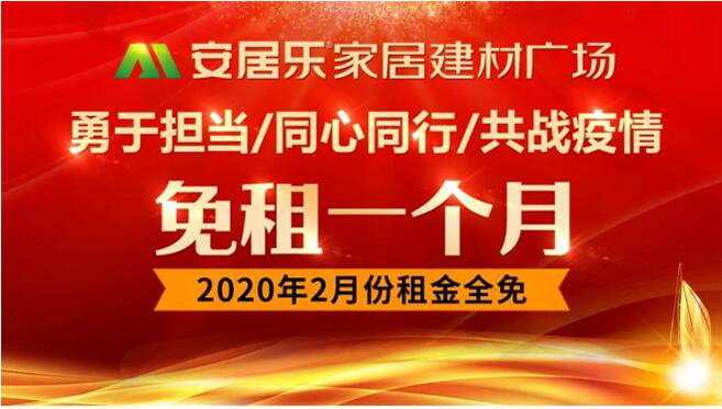 安居乐作为一个老牌有担当的企业,为了实际减轻各厂商的经营压力,轻装上阵,快速恢复经营状态。经公司研究决定,对安居乐全体厂商2020年2月份租金全免。另外也会加大全年的营销费用,全力支持厂商做好活动!